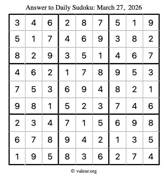As promised, here is the solution to the March 27, 2026 sudoku puzzle: