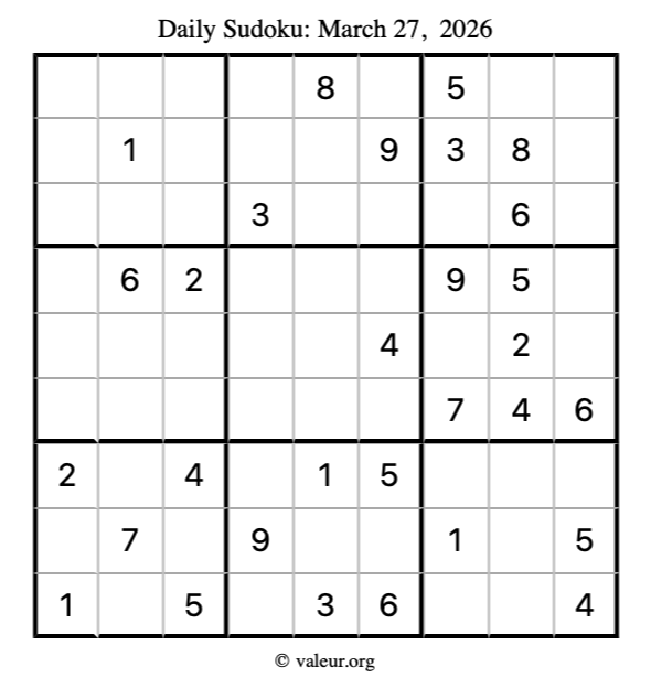 Here is the March 27, 2026 sudoku puzzle. You are welcome to print a copy to solve by hand. For your convenience, we have also included the solution further down the page so you can check your work.