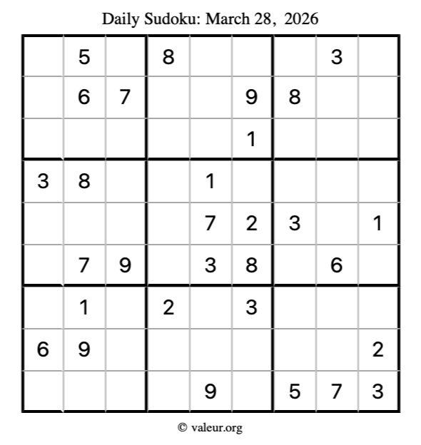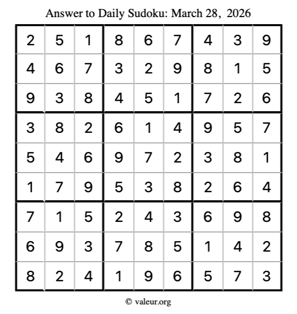 Here is the March 28, 2026 sudoku puzzle. You are welcome to print a copy to solve by hand. For your convenience, we have also included the solution further down the page so you can check your work.