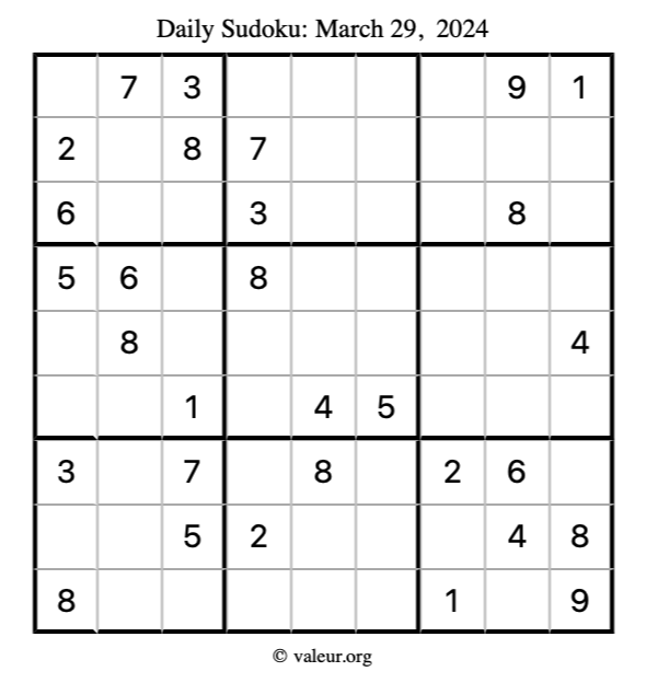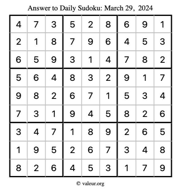 Here is the March 29, 2024 sudoku puzzle. You are welcome to print a copy to solve by hand. For your convenience, we have also included the solution further down the page so you can check your work.