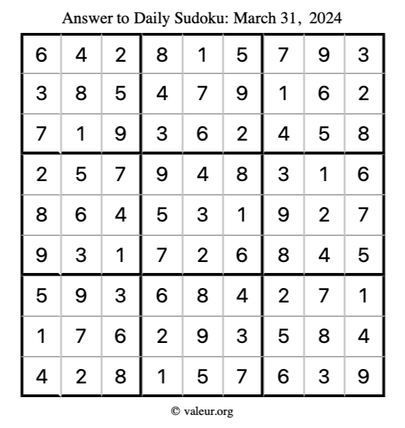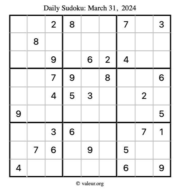 Here is the March 31, 2024 sudoku puzzle. You are welcome to print a copy to solve by hand. For your convenience, we have also included the solution further down the page so you can check your work.
