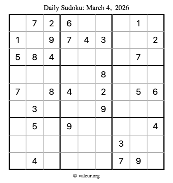 Here is the March 4, 2026 sudoku puzzle. You are welcome to print a copy to solve by hand. For your convenience, we have also included the solution further down the page so you can check your work.
