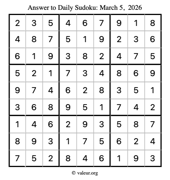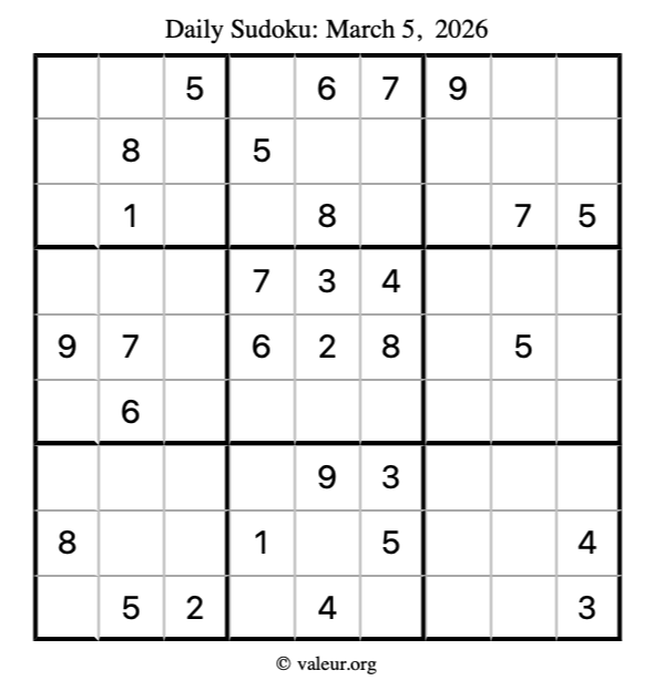 Here is the March 5, 2026 sudoku puzzle. You are welcome to print a copy to solve by hand. For your convenience, we have also included the solution further down the page so you can check your work.
