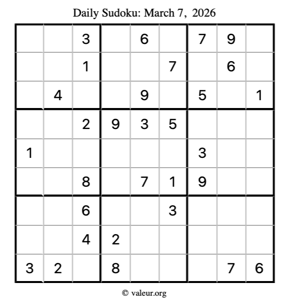Here is the March 7, 2026 sudoku puzzle. You are welcome to print a copy to solve by hand. For your convenience, we have also included the solution further down the page so you can check your work.
