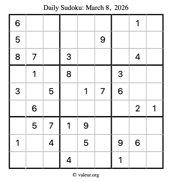 Here is the March 8, 2026 sudoku puzzle. You are welcome to print a copy to solve by hand. For your convenience, we have also included the solution further down the page so you can check your work.