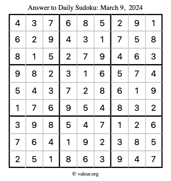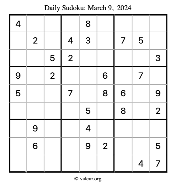 Here is the March 9, 2024 sudoku puzzle. You are welcome to print a copy to solve by hand. For your convenience, we have also included the solution further down the page so you can check your work.