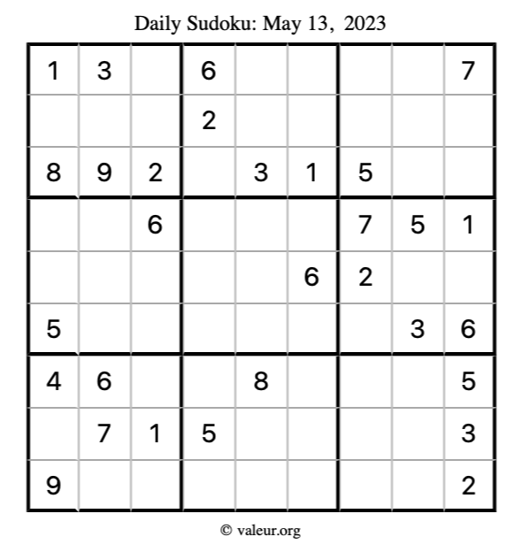 Here is the May 13, 2023 sudoku puzzle. You are welcome to print a copy to solve by hand. For your convenience, we have also included the solution further down the page so you can check your work.