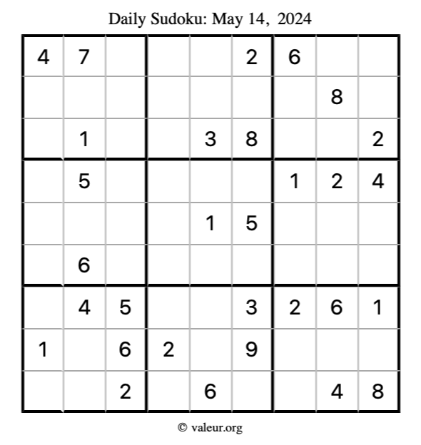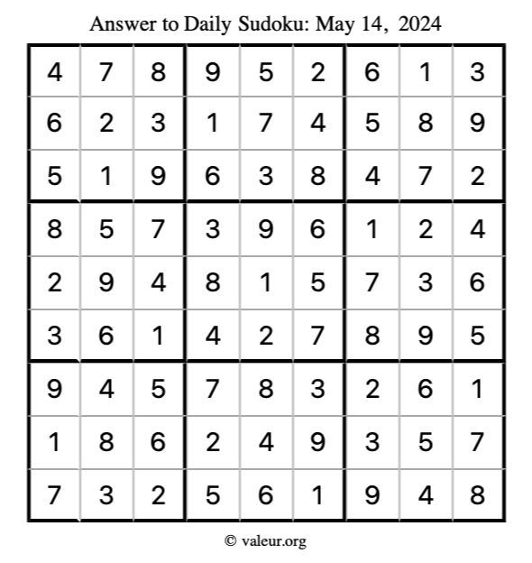 Here is the May 14, 2024 sudoku puzzle. You are welcome to print a copy to solve by hand. For your convenience, we have also included the solution further down the page so you can check your work.