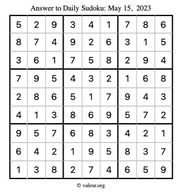Here is the May 15, 2023 sudoku puzzle. You are welcome to print a copy to solve by hand. For your convenience, we have also included the solution further down the page so you can check your work.