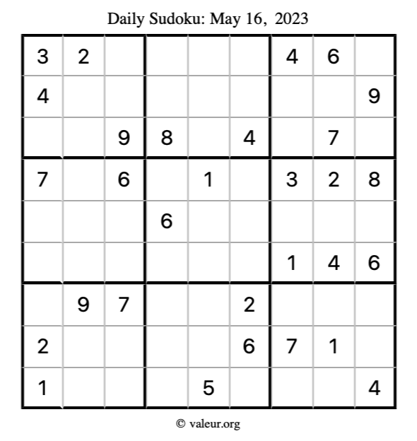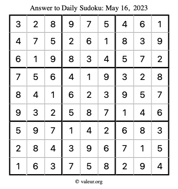 Here is the May 16, 2023 sudoku puzzle. You are welcome to print a copy to solve by hand. For your convenience, we have also included the solution further down the page so you can check your work.