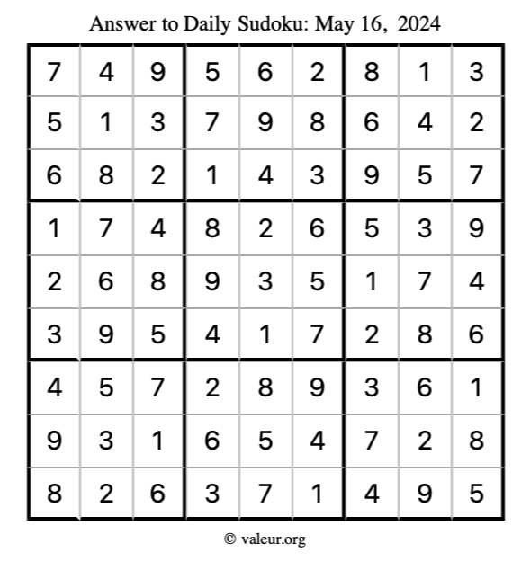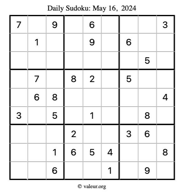 Here is the May 16, 2024 sudoku puzzle. You are welcome to print a copy to solve by hand. For your convenience, we have also included the solution further down the page so you can check your work.