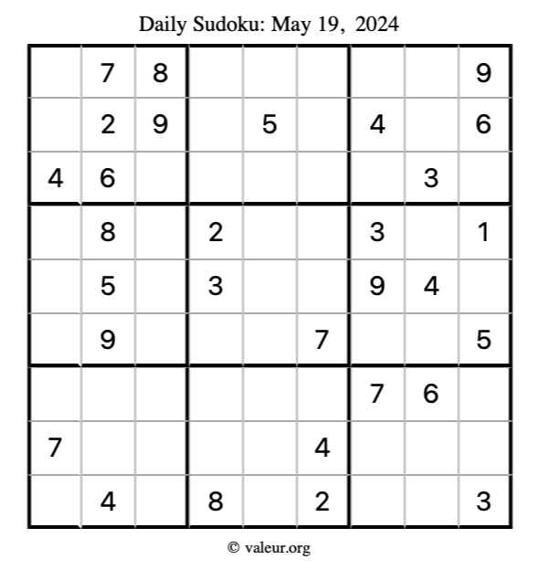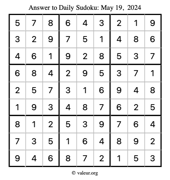 Here is the May 19, 2024 sudoku puzzle. You are welcome to print a copy to solve by hand. For your convenience, we have also included the solution further down the page so you can check your work.