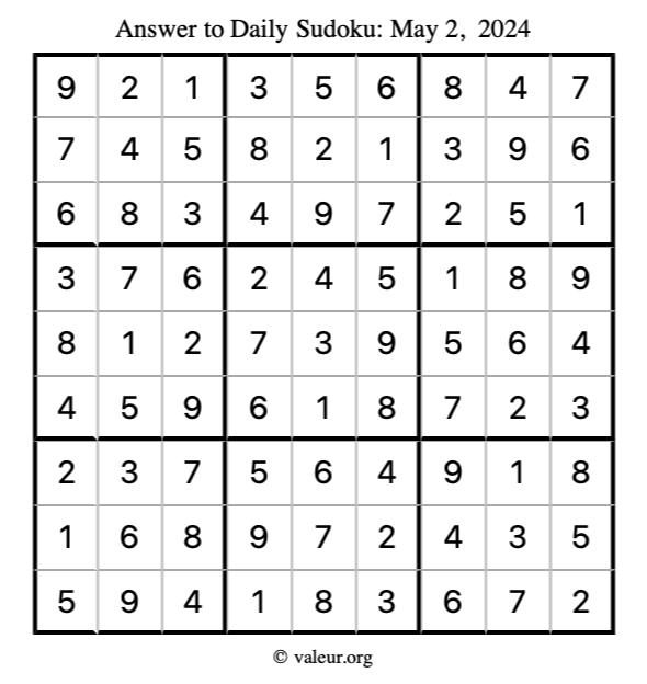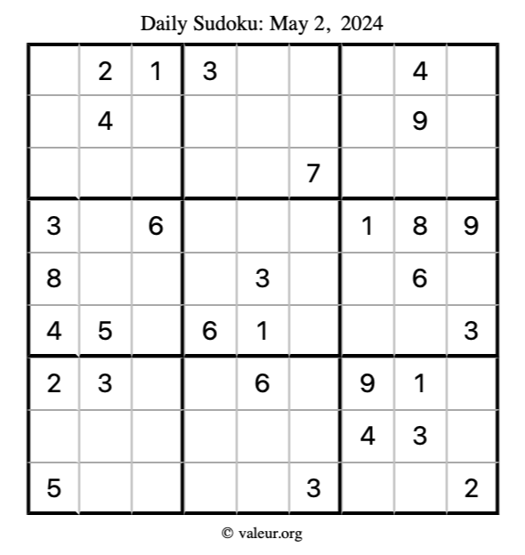 Here is the May 2, 2024 sudoku puzzle. You are welcome to print a copy to solve by hand. For your convenience, we have also included the solution further down the page so you can check your work.