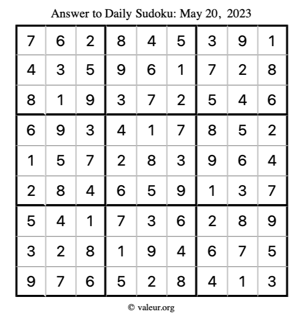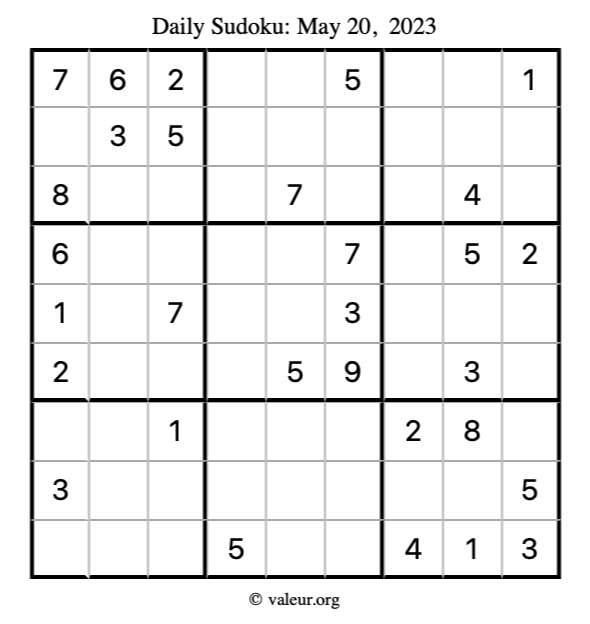 Here is the May 20, 2023 sudoku puzzle. You are welcome to print a copy to solve by hand. For your convenience, we have also included the solution further down the page so you can check your work.