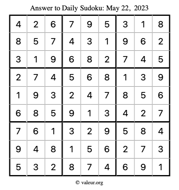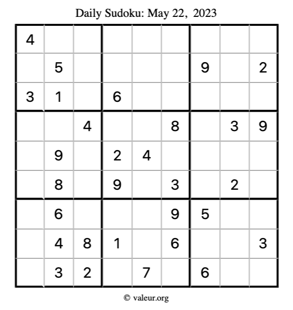Here is the May 22, 2023 sudoku puzzle. You are welcome to print a copy to solve by hand. For your convenience, we have also included the solution further down the page so you can check your work.
