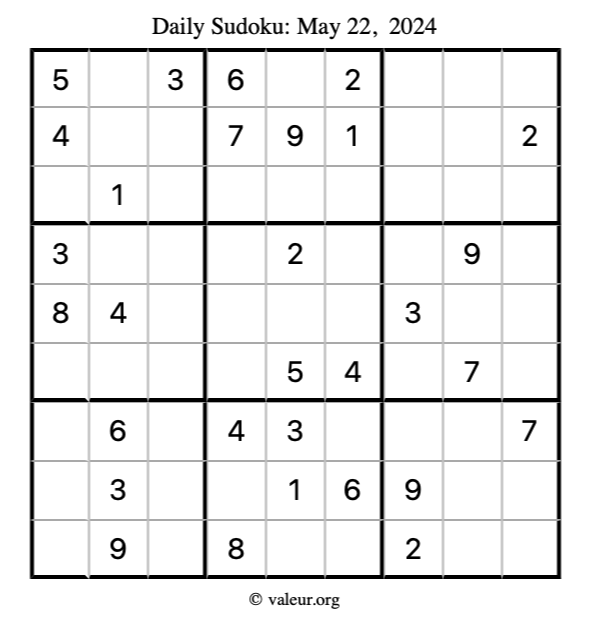 Here is the May 22, 2024 sudoku puzzle. You are welcome to print a copy to solve by hand. For your convenience, we have also included the solution further down the page so you can check your work.