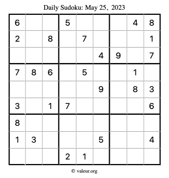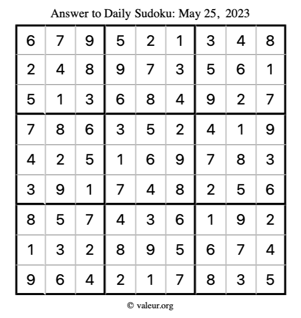 Here is the May 25, 2023 sudoku puzzle. You are welcome to print a copy to solve by hand. For your convenience, we have also included the solution further down the page so you can check your work.