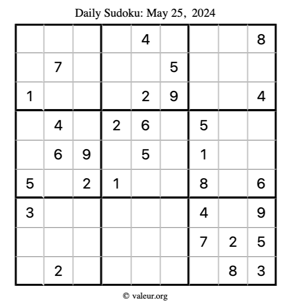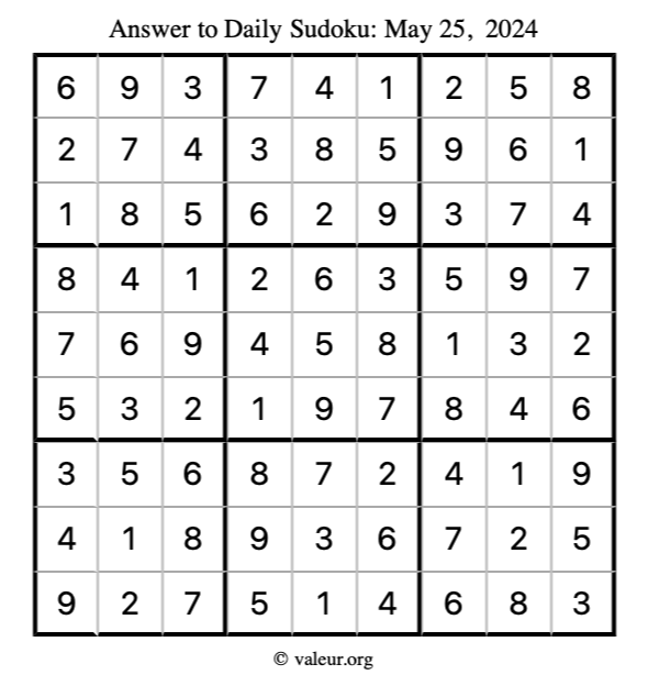 Here is the May 25, 2024 sudoku puzzle. You are welcome to print a copy to solve by hand. For your convenience, we have also included the solution further down the page so you can check your work.