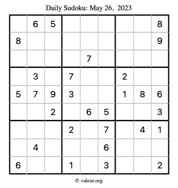 Here is the May 26, 2023 sudoku puzzle. You are welcome to print a copy to solve by hand. For your convenience, we have also included the solution further down the page so you can check your work.