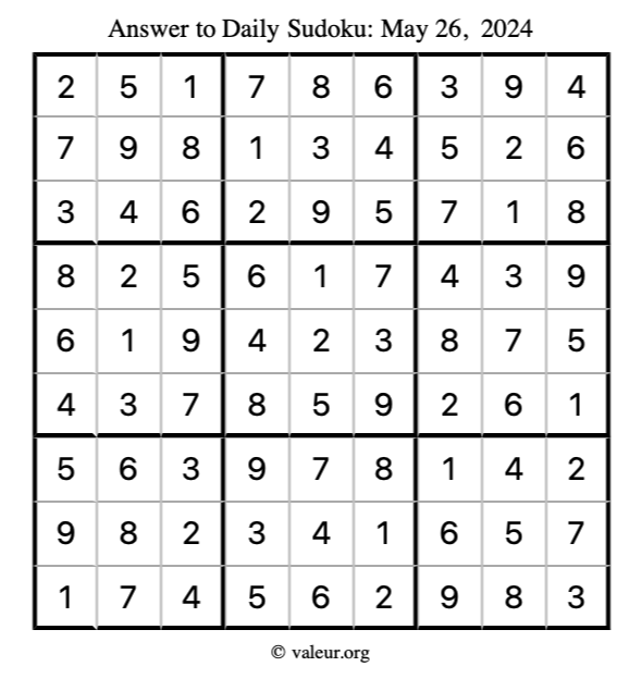 Here is the May 26, 2024 sudoku puzzle. You are welcome to print a copy to solve by hand. For your convenience, we have also included the solution further down the page so you can check your work.