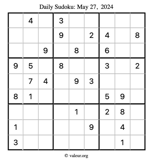 Here is the May 27, 2024 sudoku puzzle. You are welcome to print a copy to solve by hand. For your convenience, we have also included the solution further down the page so you can check your work.