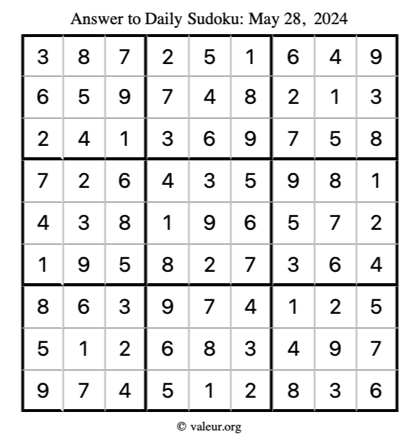 Here is the May 28, 2024 sudoku puzzle. You are welcome to print a copy to solve by hand. For your convenience, we have also included the solution further down the page so you can check your work.
