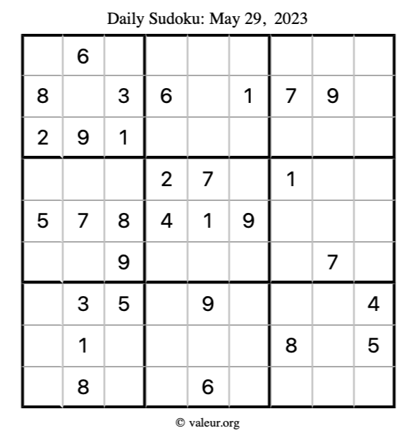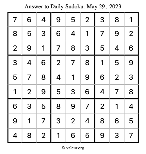 Here is the May 29, 2023 sudoku puzzle. You are welcome to print a copy to solve by hand. For your convenience, we have also included the solution further down the page so you can check your work.