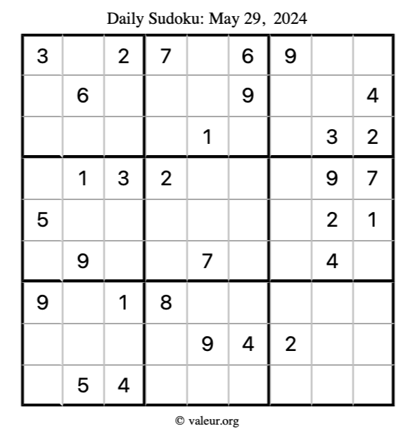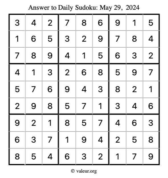 Here is the May 29, 2024 sudoku puzzle. You are welcome to print a copy to solve by hand. For your convenience, we have also included the solution further down the page so you can check your work.