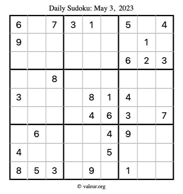 Here is the May 3, 2023 sudoku puzzle. You are welcome to print a copy to solve by hand. For your convenience, we have also included the solution further down the page so you can check your work.