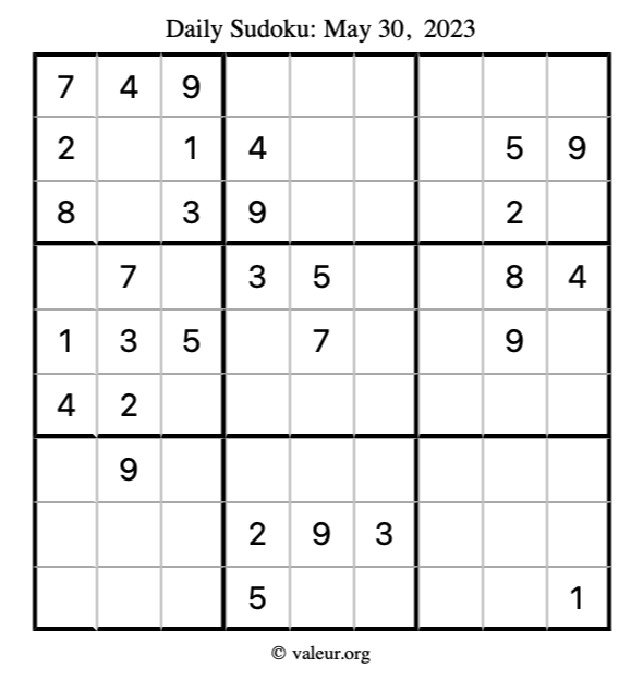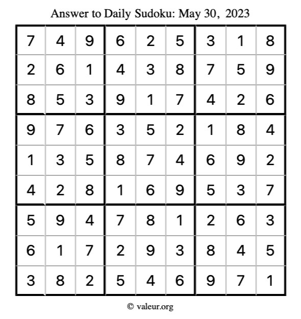 Here is the May 30, 2023 sudoku puzzle. You are welcome to print a copy to solve by hand. For your convenience, we have also included the solution further down the page so you can check your work.