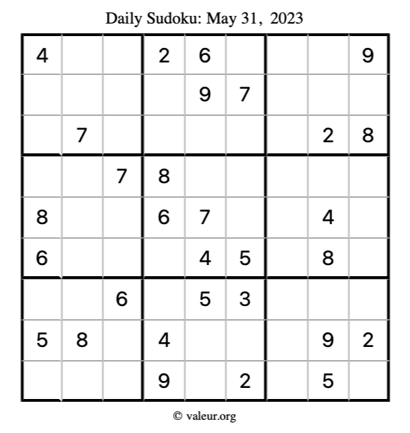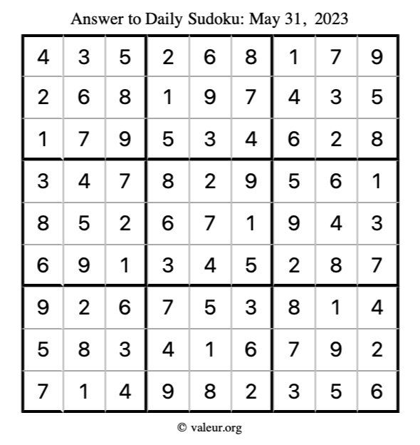 Here is the May 31, 2023 sudoku puzzle. You are welcome to print a copy to solve by hand. For your convenience, we have also included the solution further down the page so you can check your work.