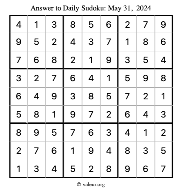 Here is the May 31, 2024 sudoku puzzle. You are welcome to print a copy to solve by hand. For your convenience, we have also included the solution further down the page so you can check your work.