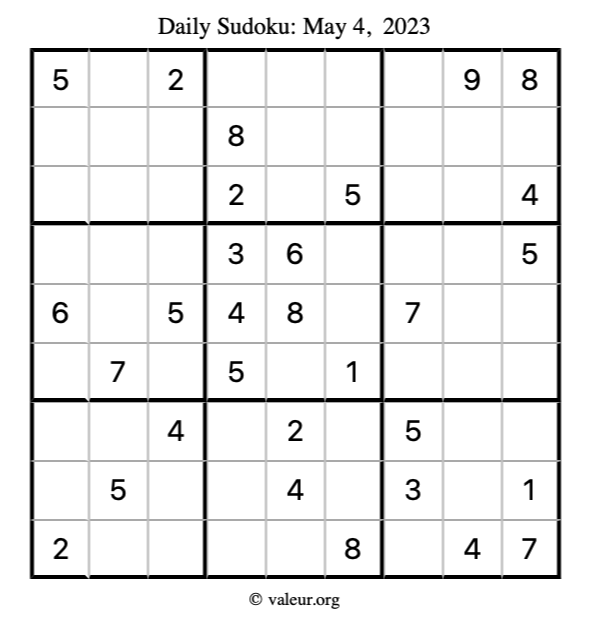 Here is the May 4, 2023 sudoku puzzle. You are welcome to print a copy to solve by hand. For your convenience, we have also included the solution further down the page so you can check your work.