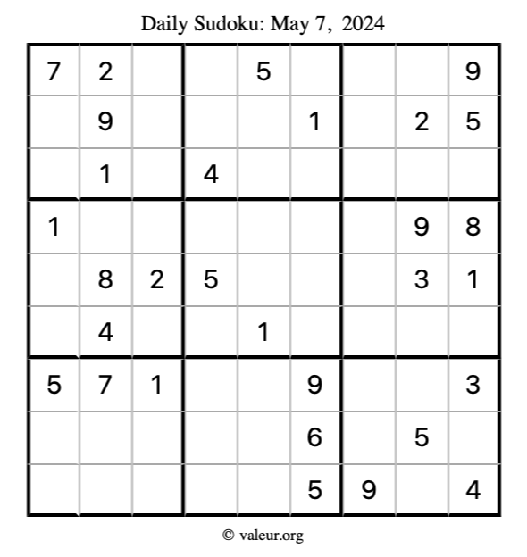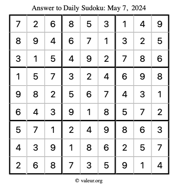 Here is the May 7, 2024 sudoku puzzle. You are welcome to print a copy to solve by hand. For your convenience, we have also included the solution further down the page so you can check your work.