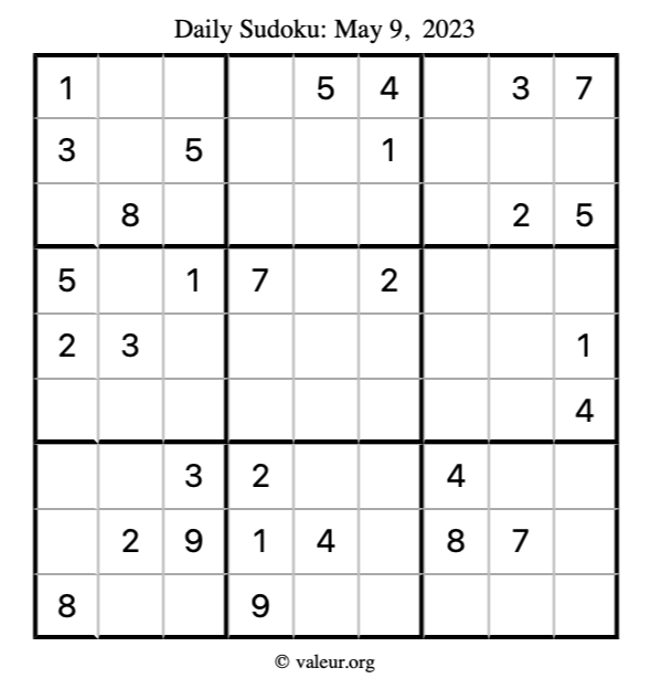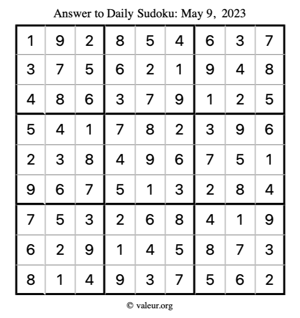 Here is the May 9, 2023 sudoku puzzle. You are welcome to print a copy to solve by hand. For your convenience, we have also included the solution further down the page so you can check your work.