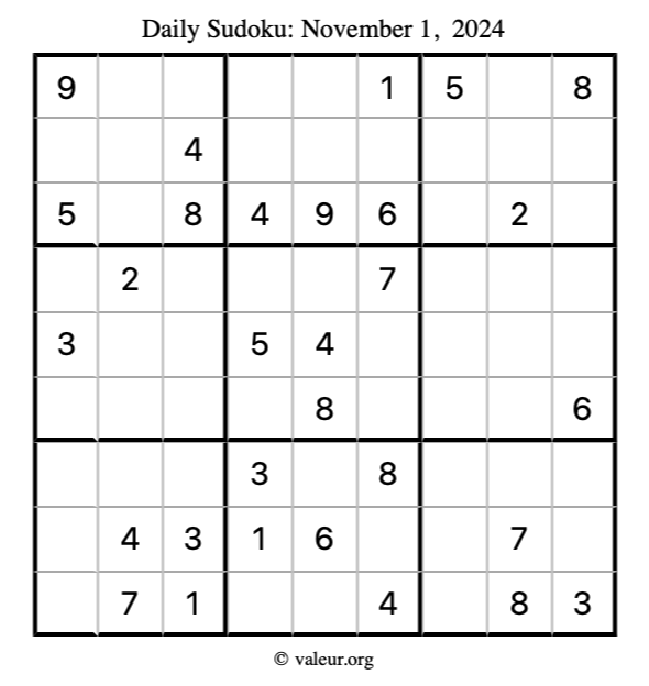 Here is the November 1, 2024 sudoku puzzle. You are welcome to print a copy to solve by hand. For your convenience, we have also included the solution further down the page so you can check your work.