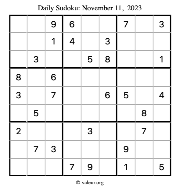 Here is the November 11, 2023 sudoku puzzle. You are welcome to print a copy to solve by hand. For your convenience, we have also included the solution further down the page so you can check your work.
