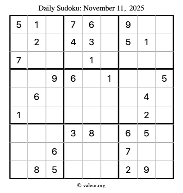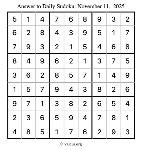 Here is the November 11, 2025 sudoku puzzle. You are welcome to print a copy to solve by hand. For your convenience, we have also included the solution further down the page so you can check your work.