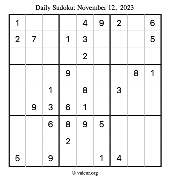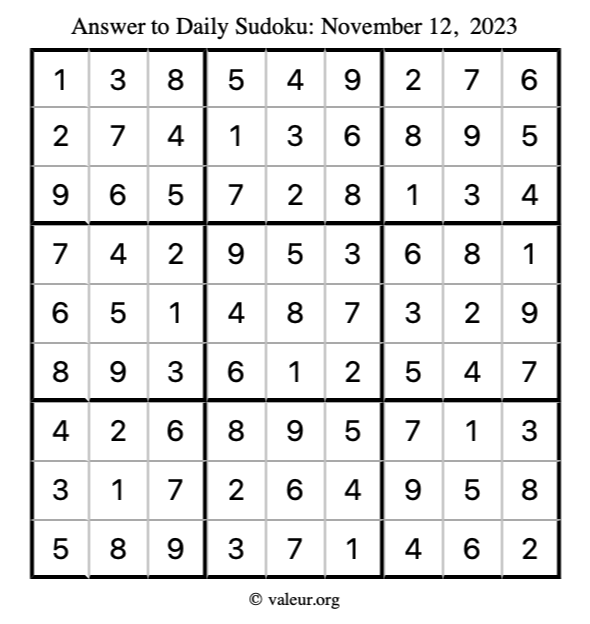 Here is the November 12, 2023 sudoku puzzle. You are welcome to print a copy to solve by hand. For your convenience, we have also included the solution further down the page so you can check your work.