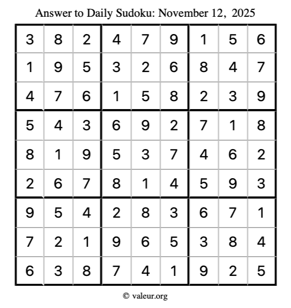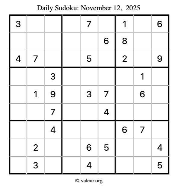 Here is the November 12, 2025 sudoku puzzle. You are welcome to print a copy to solve by hand. For your convenience, we have also included the solution further down the page so you can check your work.