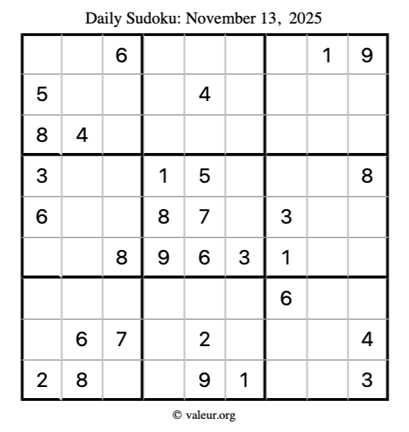 Here is the November 13, 2025 sudoku puzzle. You are welcome to print a copy to solve by hand. For your convenience, we have also included the solution further down the page so you can check your work.