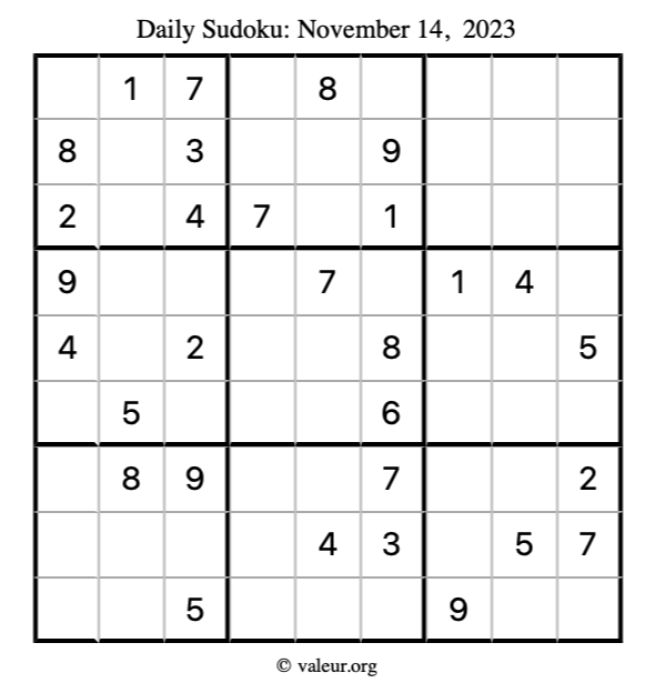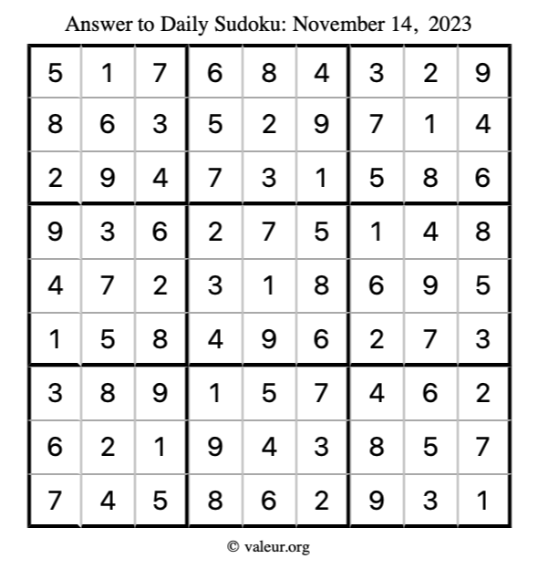 Here is the November 14, 2023 sudoku puzzle. You are welcome to print a copy to solve by hand. For your convenience, we have also included the solution further down the page so you can check your work.