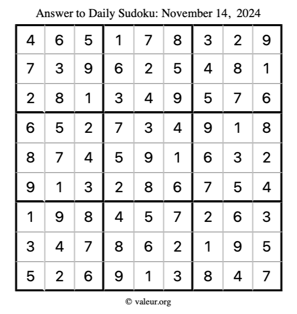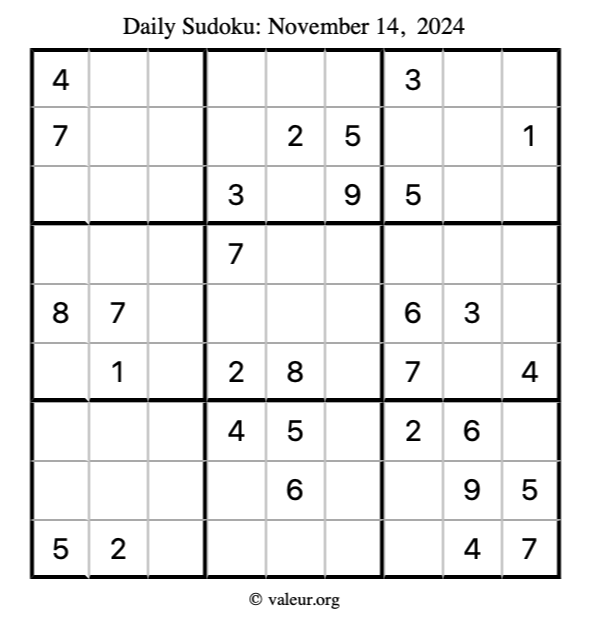Here is the November 14, 2024 sudoku puzzle. You are welcome to print a copy to solve by hand. For your convenience, we have also included the solution further down the page so you can check your work.