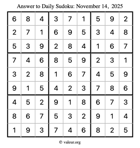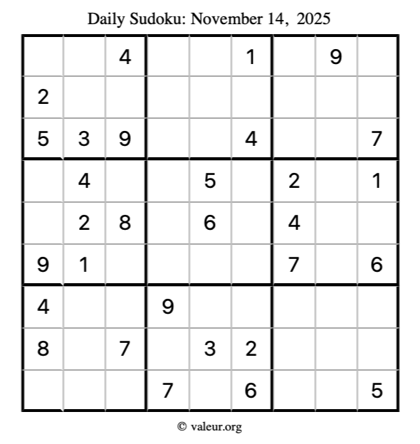 Here is the November 14, 2025 sudoku puzzle. You are welcome to print a copy to solve by hand. For your convenience, we have also included the solution further down the page so you can check your work.