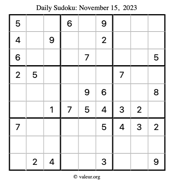 Here is the November 15, 2023 sudoku puzzle. You are welcome to print a copy to solve by hand. For your convenience, we have also included the solution further down the page so you can check your work.