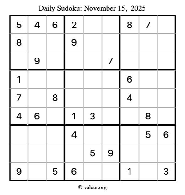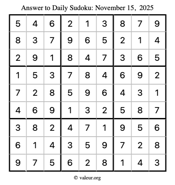Here is the November 15, 2025 sudoku puzzle. You are welcome to print a copy to solve by hand. For your convenience, we have also included the solution further down the page so you can check your work.