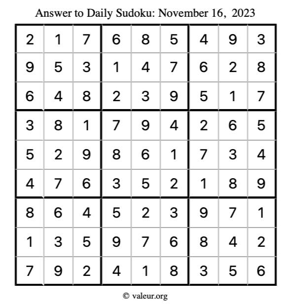 Here is the November 16, 2023 sudoku puzzle. You are welcome to print a copy to solve by hand. For your convenience, we have also included the solution further down the page so you can check your work.