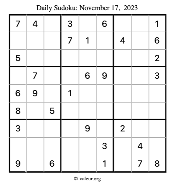 Here is the November 17, 2023 sudoku puzzle. You are welcome to print a copy to solve by hand. For your convenience, we have also included the solution further down the page so you can check your work.
