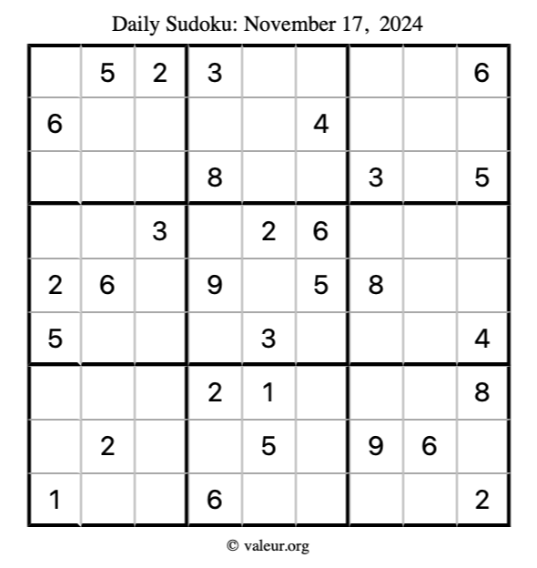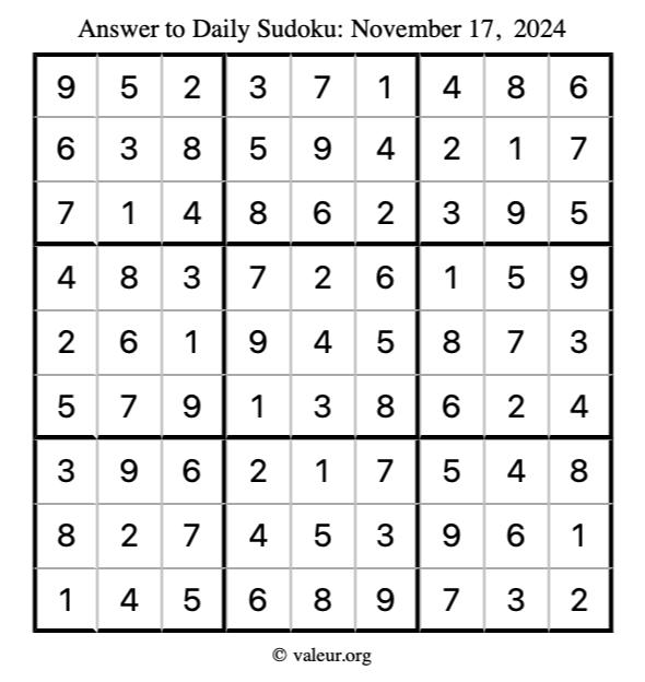 Here is the November 17, 2024 sudoku puzzle. You are welcome to print a copy to solve by hand. For your convenience, we have also included the solution further down the page so you can check your work.