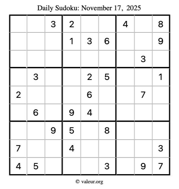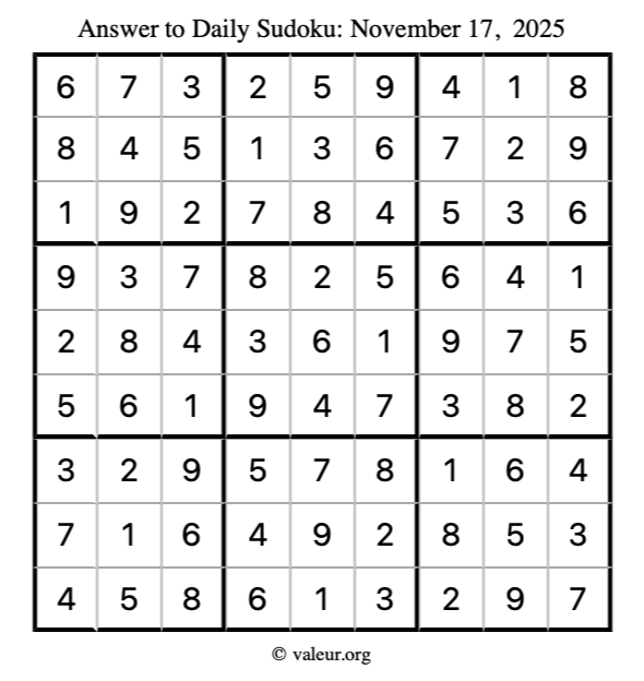Here is the November 17, 2025 sudoku puzzle. You are welcome to print a copy to solve by hand. For your convenience, we have also included the solution further down the page so you can check your work.